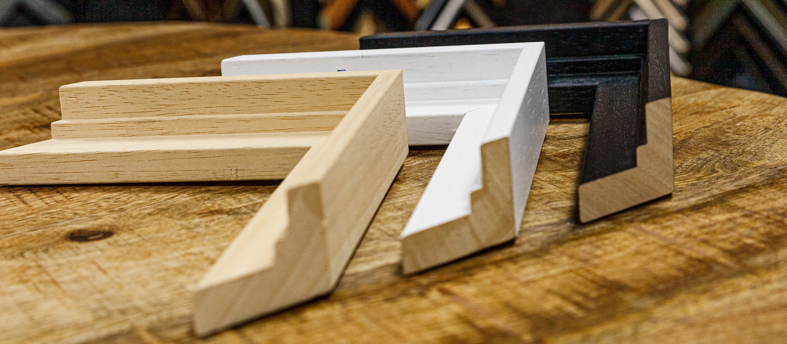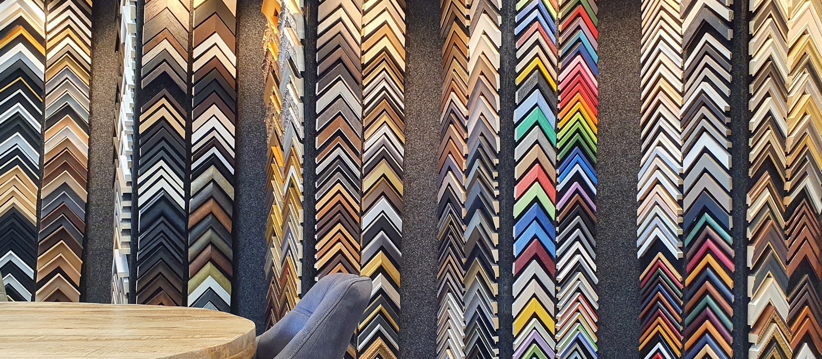 Uitgebreid assortiment houten- en aluminium staaflijsten, spieramen, passe-partoutkarton en accessoires voor de lijstenmaker, galeries, musea, etc.